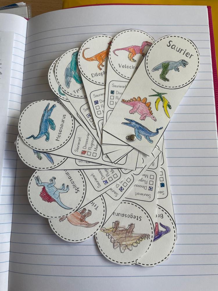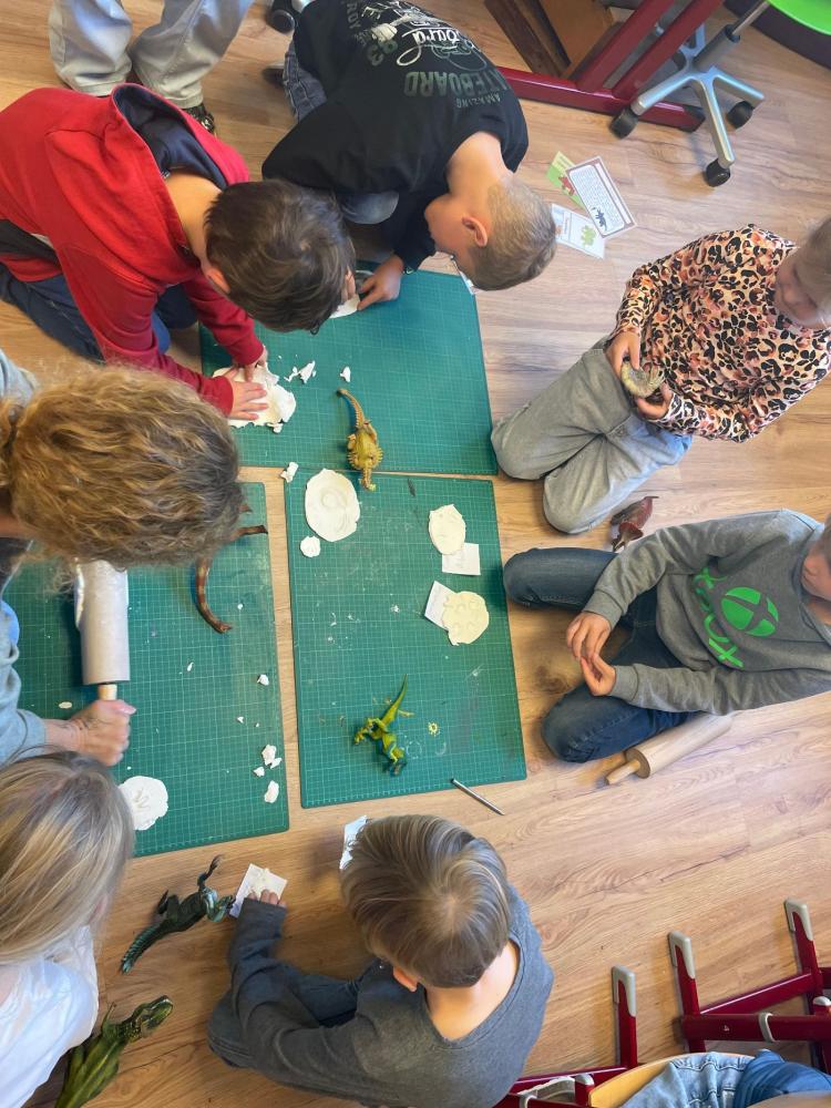 Kreativ wurde es beim Gestalten von Steckbriefen für einen eigenen Dinosaurier, Fußabdrücken der großen Giganten sowie Ammonitenabdrücken aus übrig gebliebener Modelliermasse.