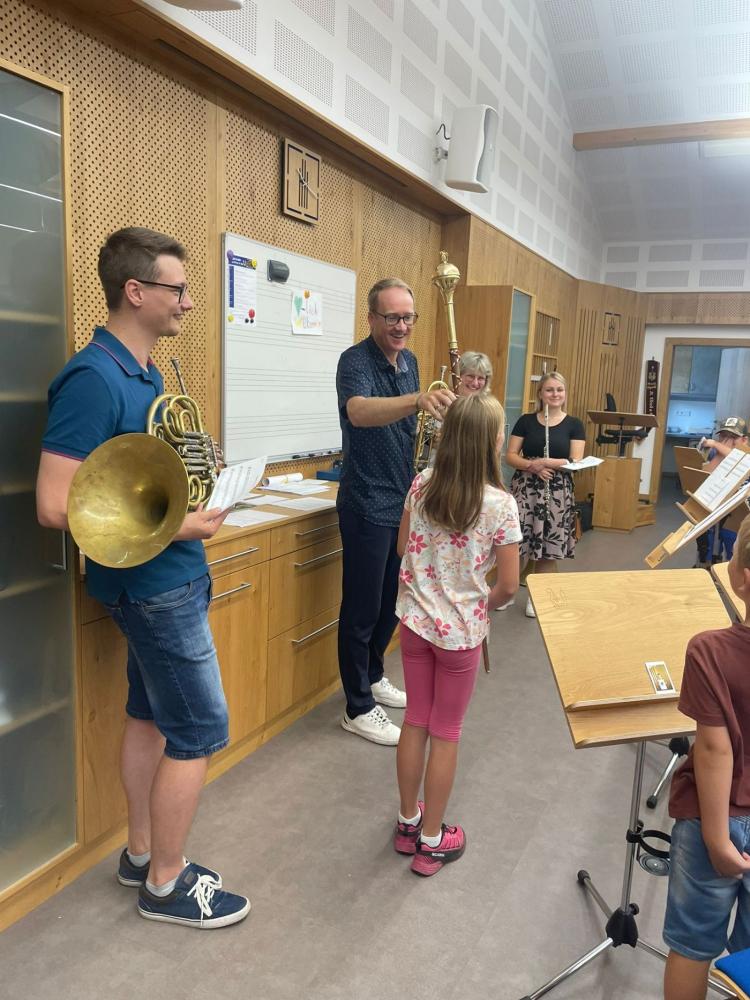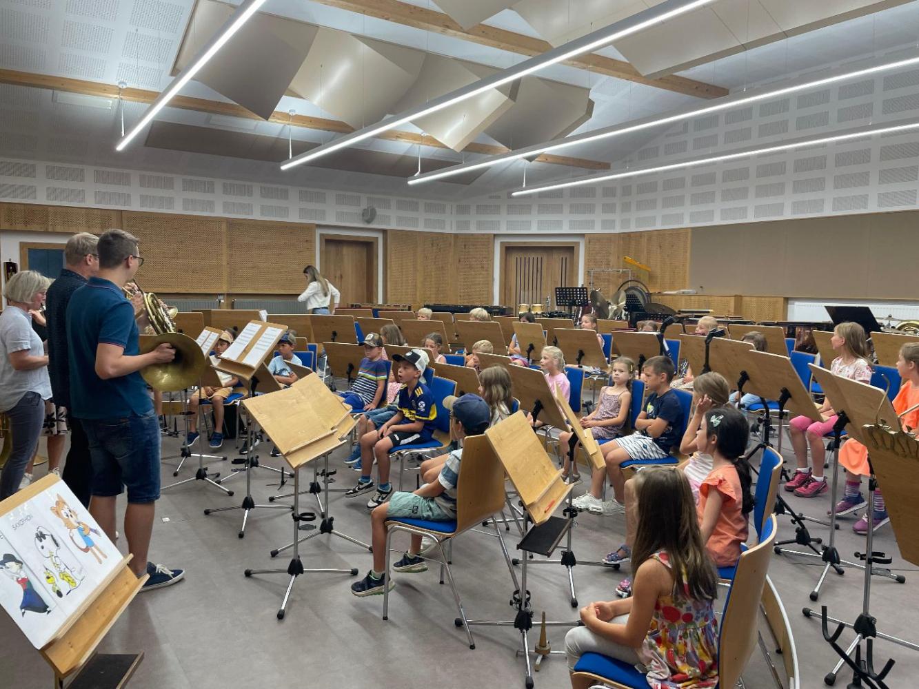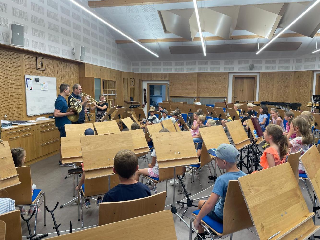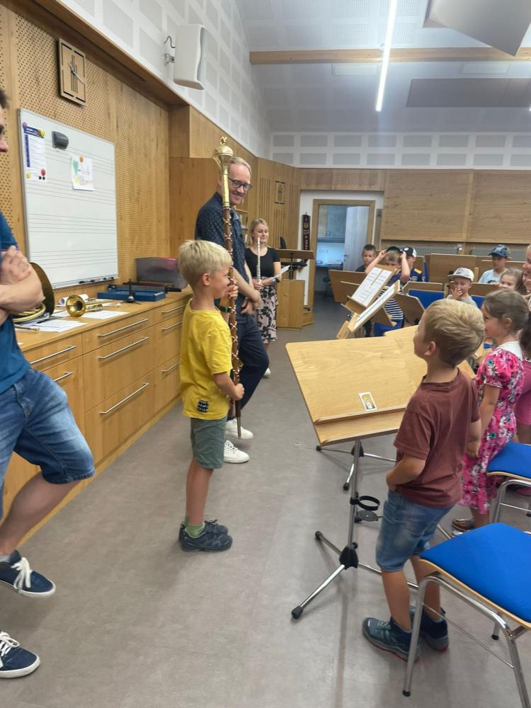 Nach einem kleinen, aber feinen Konzert präsentierten die Musikerinnen und Musiker ihre Instrumente – von den Holz- und Blechblasinstrumenten bis hin zum Schlagzeug. Die Kinder hörten gespannt zu, stellten Fragen und konnten dabei viel über die verschiedenen Instrumente lernen.