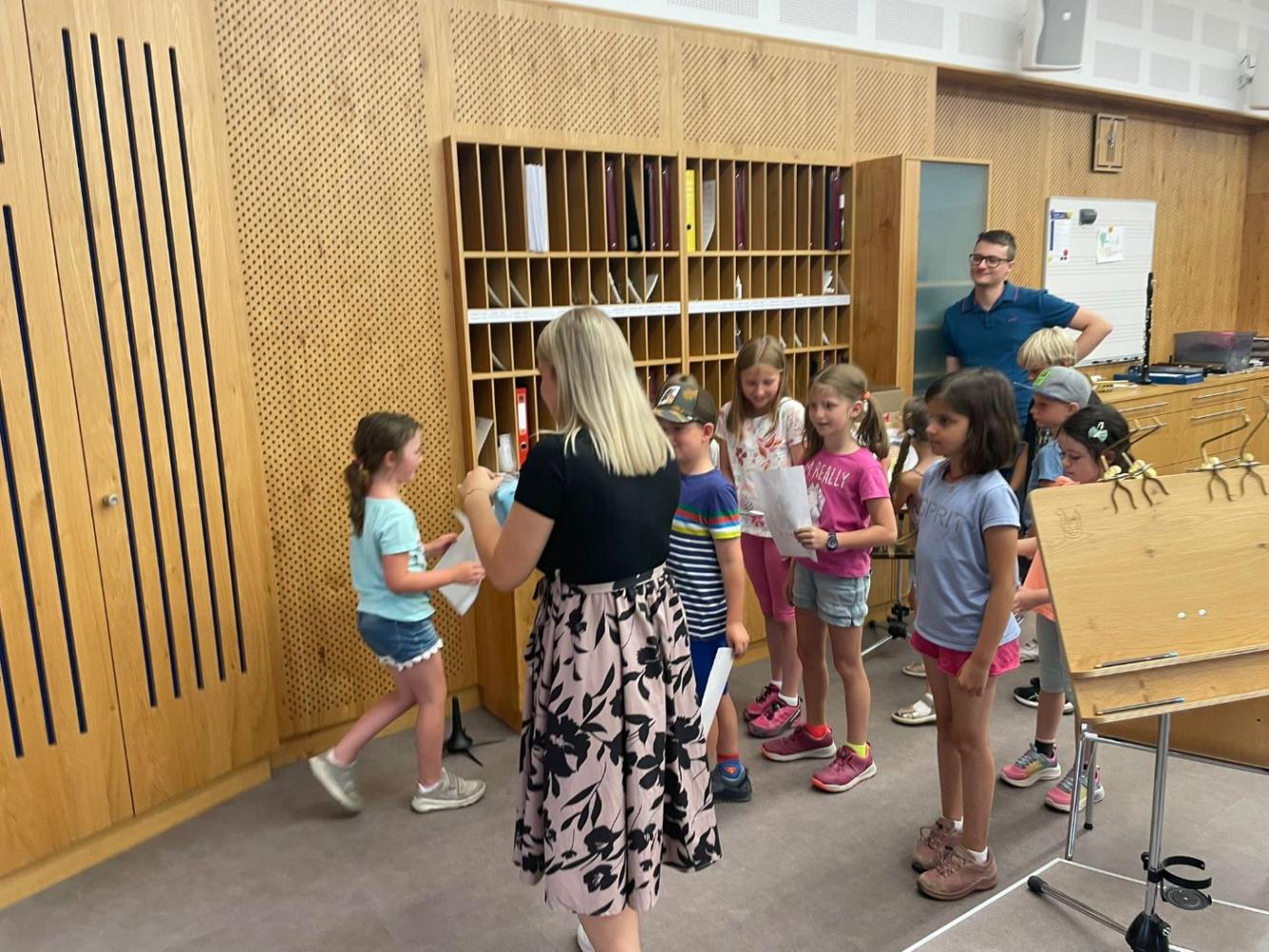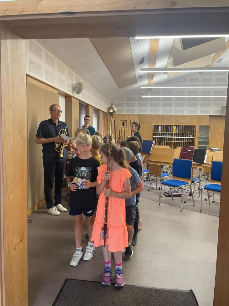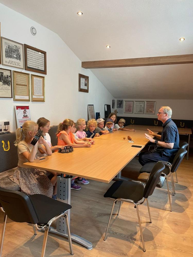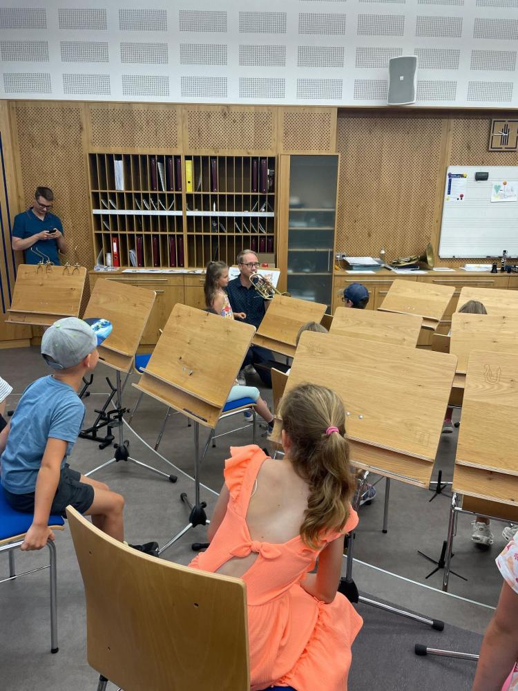 Nach einem kleinen, aber feinen Konzert präsentierten die Musikerinnen und Musiker ihre Instrumente – von den Holz- und Blechblasinstrumenten bis hin zum Schlagzeug. Die Kinder hörten gespannt zu, stellten Fragen und konnten dabei viel über die verschiedenen Instrumente lernen.